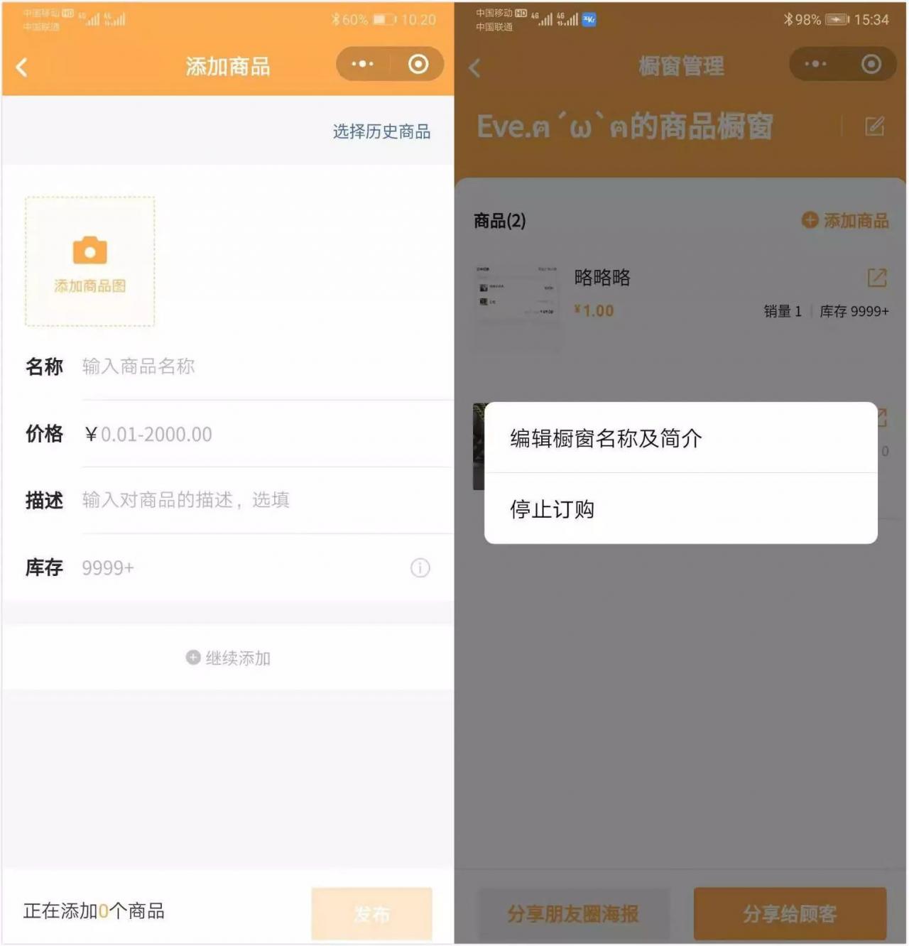 在商品上,微信商品櫥窗支持發(fā)布9張商品圖片、名稱、價(jià)格、商品描述和庫(kù)存 等5部分信息。