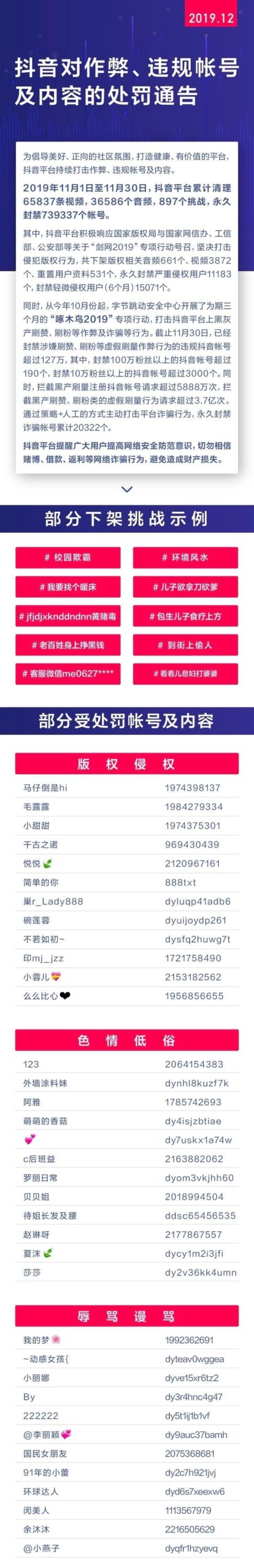 昨天,抖音公布了12月份最新的“對作弊違規(guī)賬號及內(nèi)容的處罰通告”。