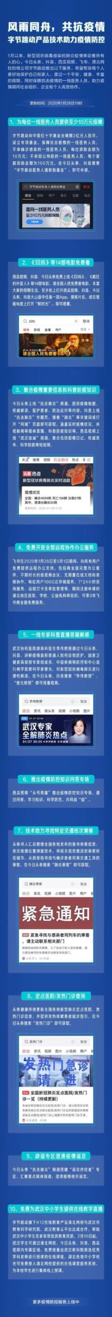 1月28日,今日頭條、抖音母公司針對(duì)此次新型肺炎疫情推出10項(xiàng)全新服務(wù)(詳情見(jiàn)下圖)。其中,武漢中小學(xué)生刷抖音就能免費(fèi)在線學(xué)習(xí)了。