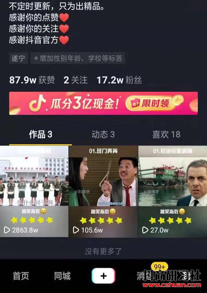 新賬號(hào)僅僅發(fā)布3個(gè)視頻,漲粉17萬 ;第一個(gè)視頻播放量15萬+,第三個(gè)視頻播放量突破1700W+。
