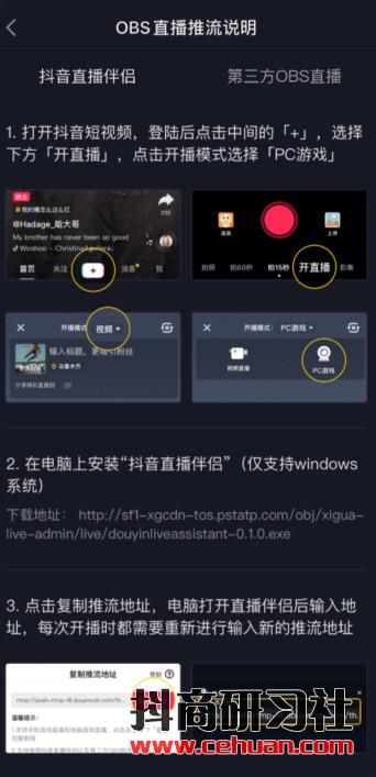 推流入口:抖音APP下方「」——開(kāi)直播——「PC游戲」;推流工具:抖音直播伴侶、第三方OBS直播;