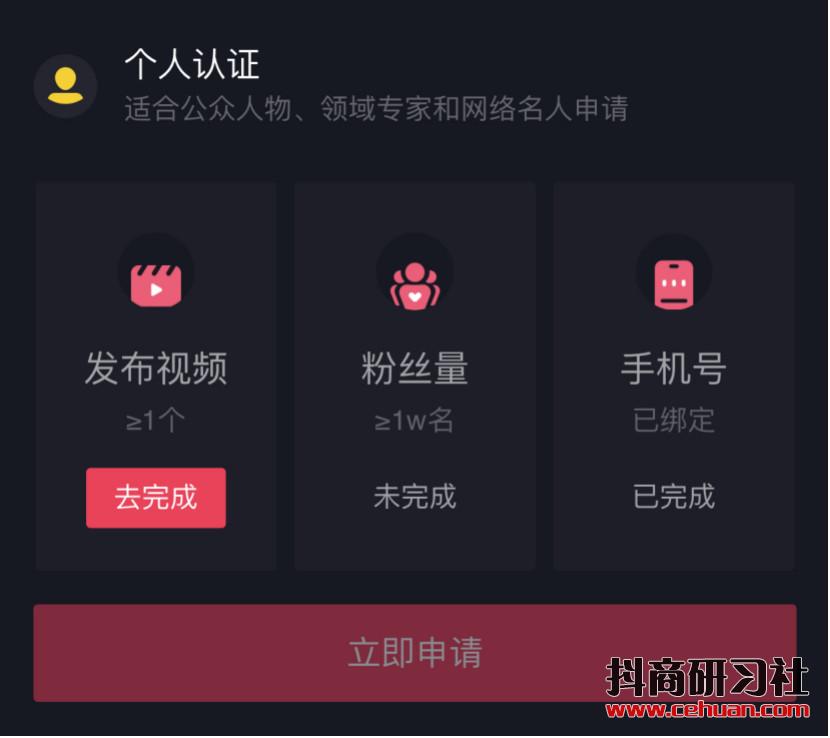 后期可以進(jìn)行官方認(rèn)證,在官方認(rèn)證賬號(hào)中政府機(jī)構(gòu)號(hào)級(jí)別最高,其次是企業(yè)號(hào)、MCN機(jī)構(gòu)旗下賬號(hào)和個(gè)人認(rèn)證賬號(hào)。 申請(qǐng)個(gè)人認(rèn)證需滿(mǎn)足,發(fā)布視頻數(shù)≥1,粉絲量≥1w以及綁定手機(jī)號(hào)三個(gè)條件。