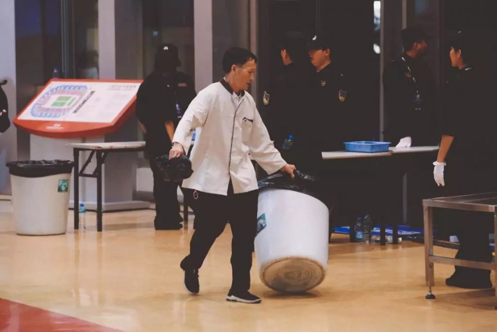 垃圾桶和掃帚是他們?nèi)康摹拔淦鳌?,是他們的努力,保障了?shù)萬(wàn)平米空間的清潔。照片中的保潔師傅正在精心調(diào)整垃圾桶的位置。