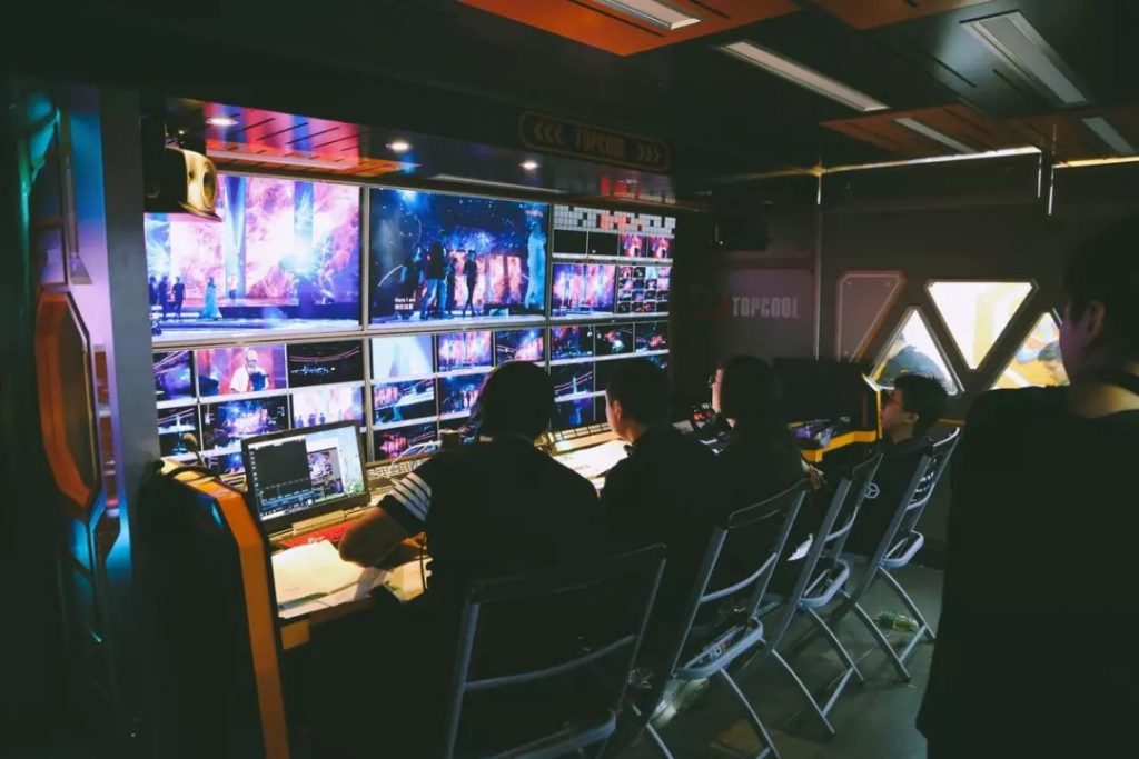 工作人員呆在狹小的導(dǎo)播車?yán)铮坎晦D(zhuǎn)睛地盯著屏幕,要把這場(chǎng)美好的晚會(huì)傳遞到千家萬(wàn)戶。