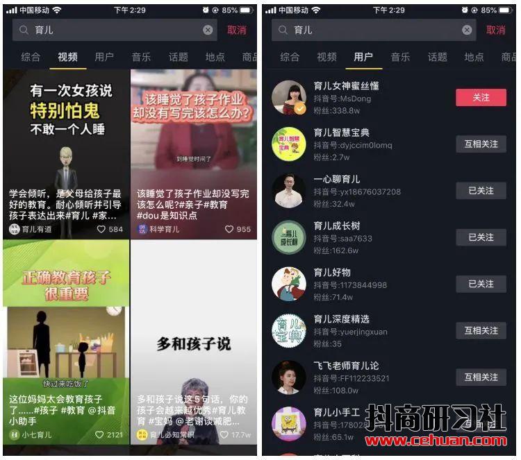 這個時候要用好抖音搜索框「視頻」和「用戶」兩個欄目,「視頻」欄目羅列了近期或者以往播放點贊數(shù)據(jù)比較好的視頻,「用戶」欄目則是與育兒相關(guān)的一些賬號,可以看到賬號昵稱和粉絲數(shù)量。