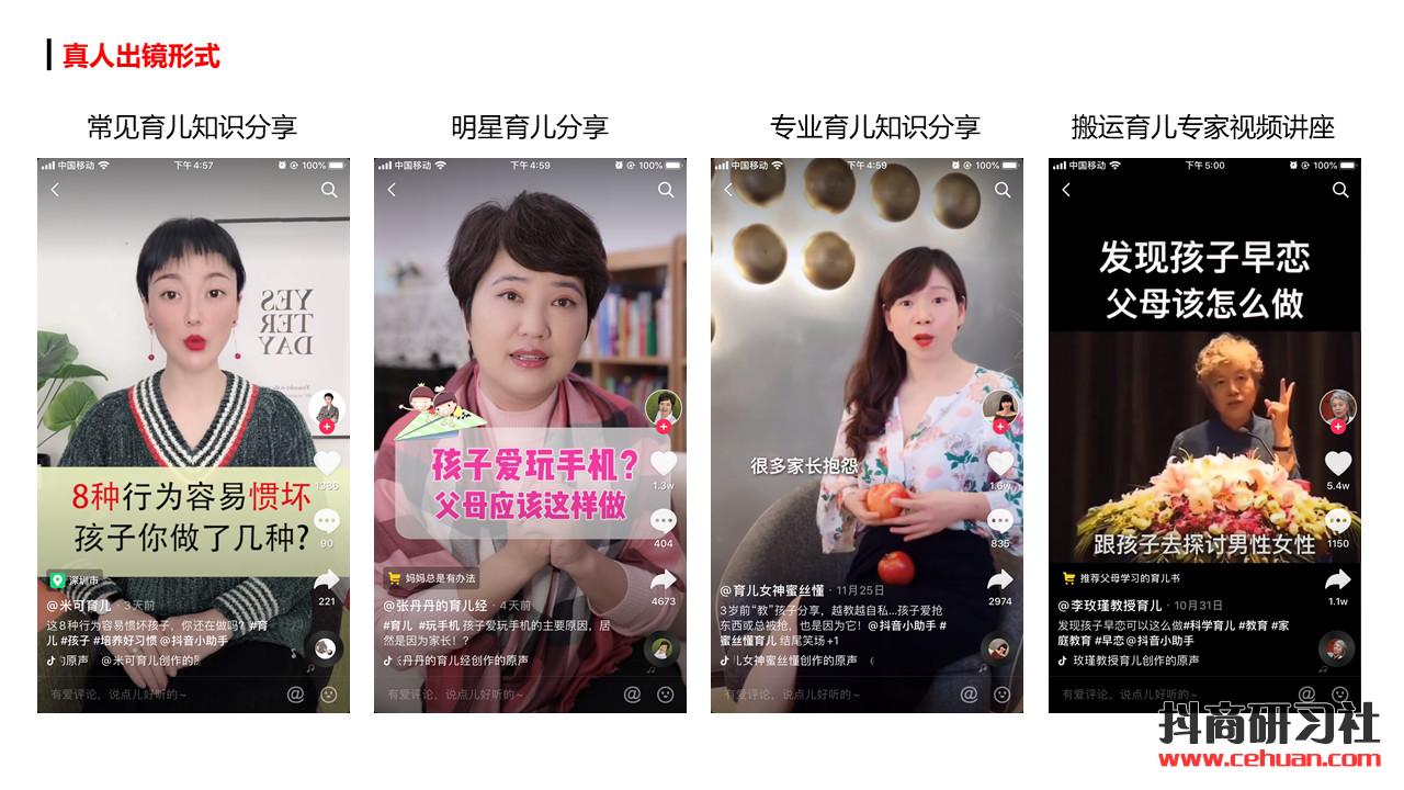其中真人出鏡又包括以下四種形式:? 常見育兒知識分享? 明星育兒分享? 專業(yè)博主育兒知識分享? 搬運育兒專家視頻講座分享