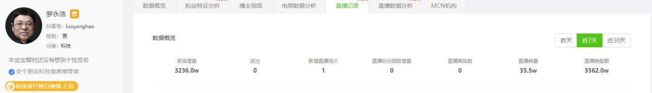 羅永浩的選擇,也可以說是對短視頻+直播行業(yè)的看好。數(shù)據(jù)顯示,羅永浩在最近7天直播銷售額3562萬 ,音浪增長3236萬。(圖片來自飛瓜數(shù)據(jù))