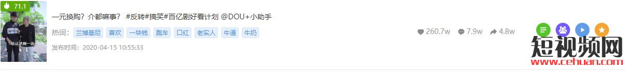 一個(gè)視頻漲粉近65w,躍進(jìn)排行榜前端(圖片來自飛瓜數(shù)據(jù))視頻主要以換購 為主,在4月14日發(fā)布了一個(gè)視頻,主要內(nèi)容講述了用一塊錢 成功換購了一臺(tái)跑車 ,該視頻在短時(shí)間內(nèi),點(diǎn)贊267.7w ,可見賬號的突然漲粉很大可能是這一視頻引起的。 (圖片來自飛瓜數(shù)據(jù))