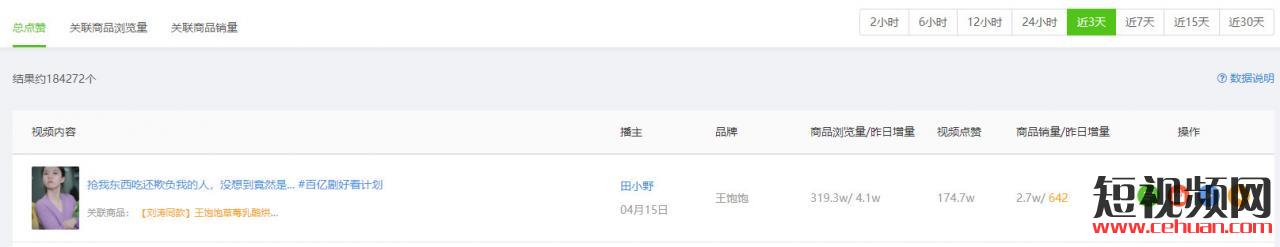 這個(gè)視頻讓相關(guān)的商品瀏覽量達(dá)到了319.3w ,銷量達(dá)到了2.7w。 通過飛瓜數(shù)據(jù)我們看到是熱門帶貨視頻排行第一 。目前近3天的熱門帶貨視頻里面也是榜首。(圖片來自飛瓜數(shù)據(jù))