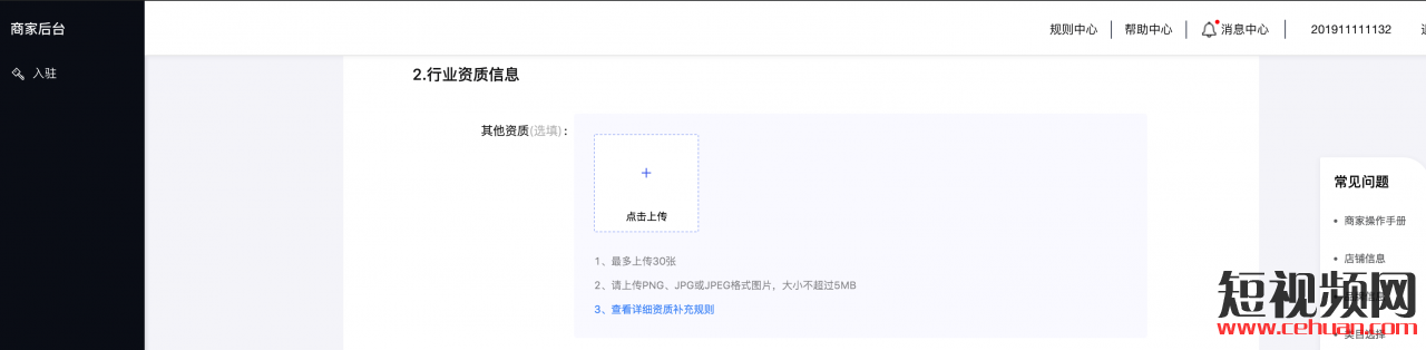 04、行業(yè)資質(zhì)信息選擇特殊主營(yíng)類目,必需要在其他信息里提交相關(guān)資質(zhì),在此處上的資質(zhì)主體需要與入駐時(shí)保持一致,且經(jīng)營(yíng)范圍包含所選的主營(yíng)類目。(一般為行業(yè)性質(zhì)證書:如3C證書,生產(chǎn)許可等)