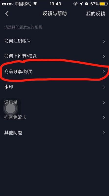 4、還是在反饋與幫助界面,然后再點(diǎn)擊“商品分享與購(gòu)買”;