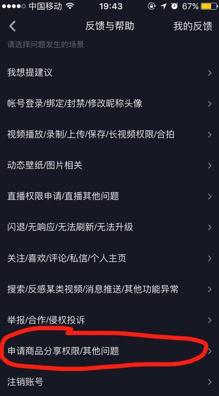 3、在反饋與幫助界面,點(diǎn)擊“申請(qǐng)商品分享權(quán)限/其他問(wèn)題”;