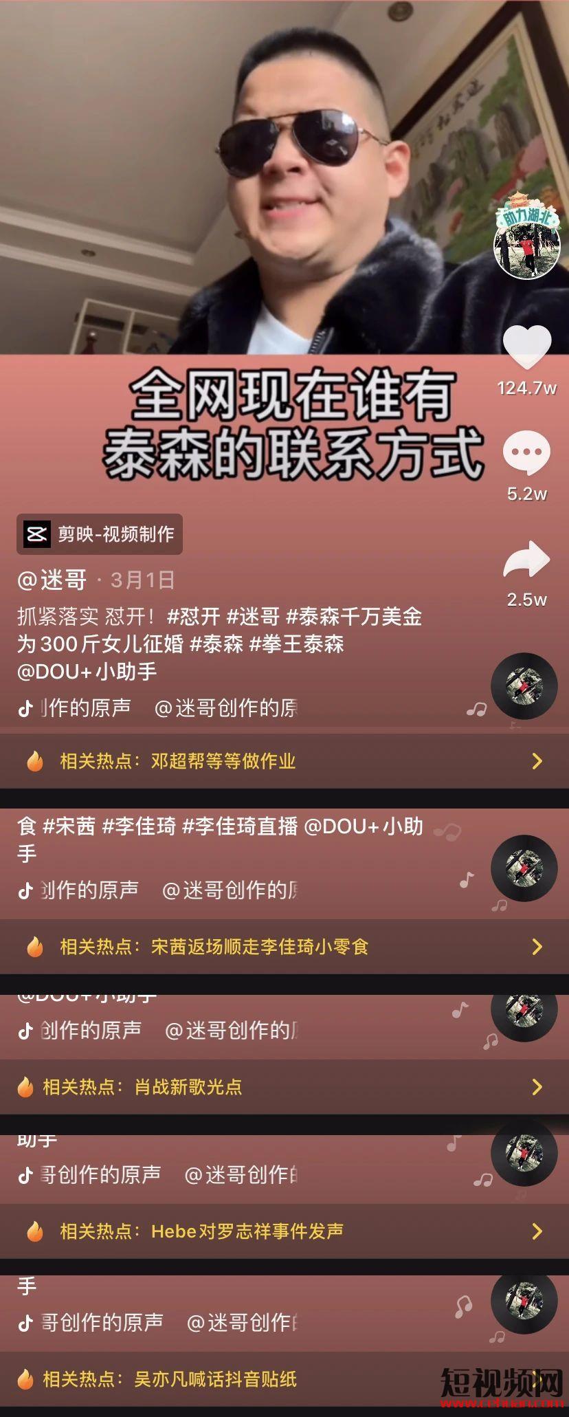 每條視頻都是當天的頭條熱點,標題文案都與熱點話題相關(guān),導致迷哥的每條視頻下面都關(guān)聯(lián)一個熱點相關(guān)話題。