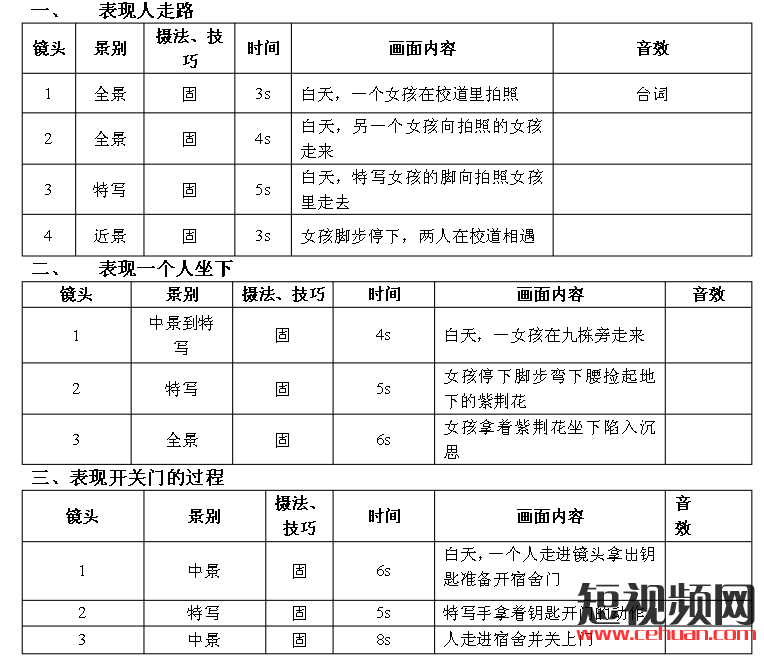 而我們拍攝抖音短視頻常用的是分鏡頭腳本,如下圖,是一個(gè)簡(jiǎn)單的抖音腳本文案模板:抖音腳本文案模板1(圖片來(lái)源于網(wǎng)絡(luò))