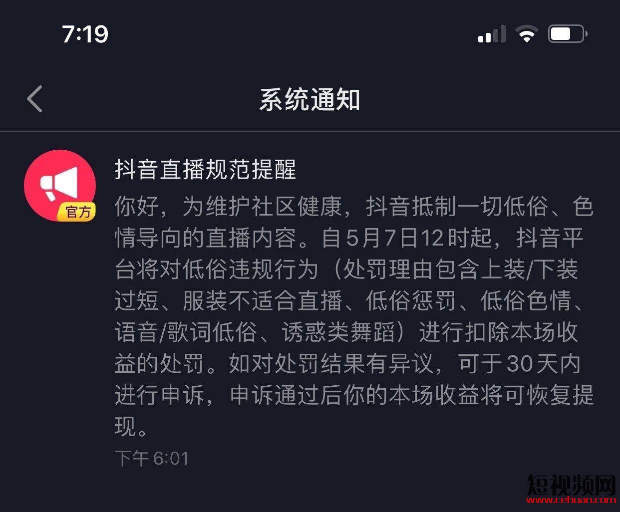 5月6日,抖音發(fā)布直播規(guī)范提醒,對低俗違規(guī)行為進行扣除本場收益的處罰,不合規(guī)行為包括上/下裝過短,服裝不適合直播,語音/歌詞低俗等。