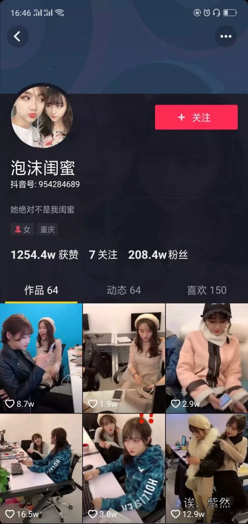 就比如這個鐘婷。既有個人人設(shè)視頻,又有一個泡沫閨蜜的雙人IP場景類的短視頻。