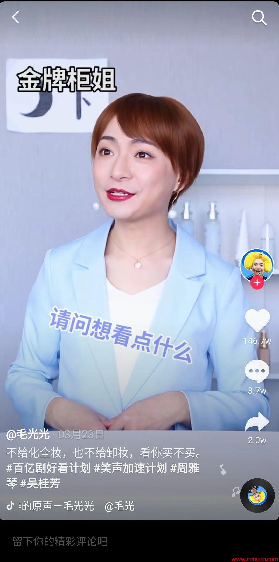 在校園劇無(wú)法取得突破的情況下,毛光光迅速轉(zhuǎn)型發(fā)布《金牌柜姐和普通柜姐的區(qū)別》 作品,該視頻的點(diǎn)贊量 達(dá)到了146.7w ,賬號(hào)的粉絲 數(shù)也以每日1 0w+ 的趨勢(shì)上漲。毛光光自此開(kāi)啟了吳桂芳的柜姐之路 。
