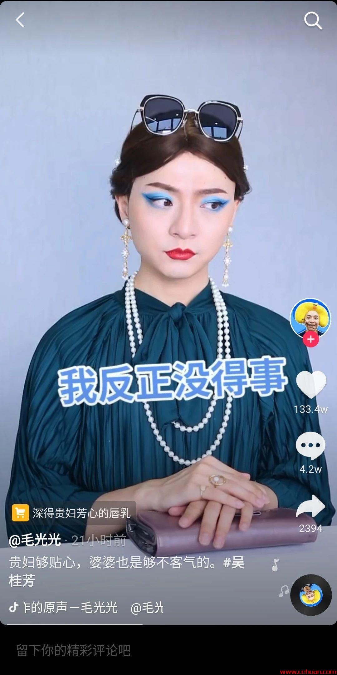 抖音里玩反串 的人很多,一人分飾幾角 的也大有人。比如毛毛姐、董代表 就是其中的典型。戴著紅棕色的假發(fā),操著一口貴州普通話,靠著“好嗨喲”走紅網(wǎng)絡(luò)的@毛毛姐 ,曾交出2個(gè)月漲粉2000w+ 的優(yōu)異成績(jī)單,目前粉絲有3438.0w 。