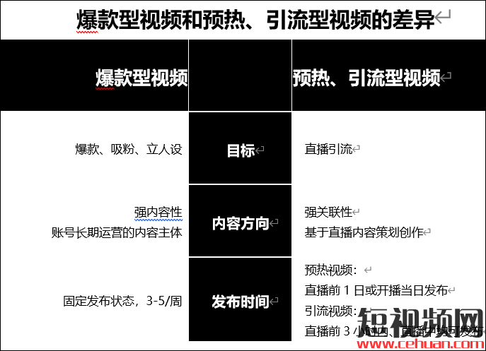 預(yù)熱、引流型視頻務(wù)必要與直播有強(qiáng)關(guān)聯(lián)性。其中預(yù)熱類和引流類還有一些不同。