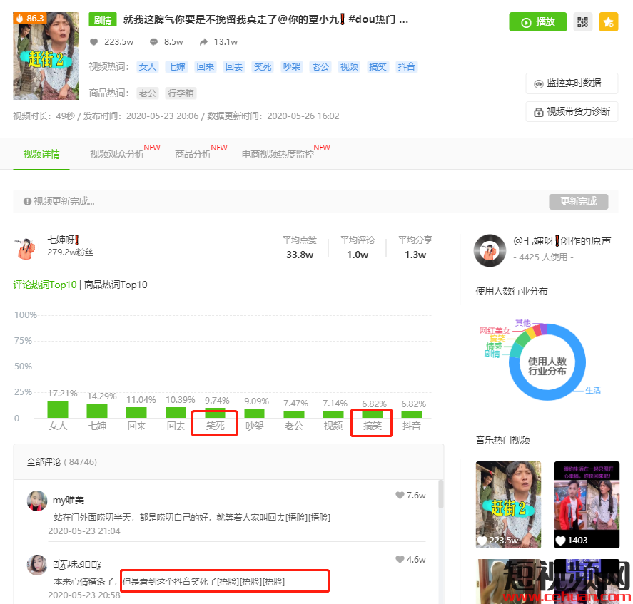 再點(diǎn)擊【視頻詳情頁(yè)】,發(fā)現(xiàn)用戶評(píng)論多以“笑死”、“搞笑” 等為主,也說(shuō)明視頻內(nèi)容戳中了用戶的笑點(diǎn)。