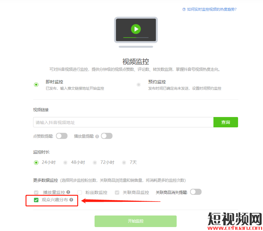 另外,通過(guò)播主視頻主頁(yè),我們發(fā)現(xiàn)視頻封面中, 七嬸均以同樣的形象出現(xiàn),并使用藍(lán)底黃字做標(biāo)題,有效加強(qiáng)了用戶的記憶點(diǎn) 。而播主在曝火的【趕街】系列視頻中加入集數(shù),可以激起觀眾好奇心 ,引導(dǎo)觀眾看完視頻后點(diǎn)擊主頁(yè),從而增加帳號(hào)熱度。 劇情類的帳號(hào)層出不窮,「七嬸呀??」能快速出圈,除了內(nèi)容接地氣之外,還由于他敢于自黑,故意扮丑 。他利用人的好奇心理 ,通過(guò)“男扮女裝”,以標(biāo)識(shí)性的服道化和豐富的微表情,形成鮮明的個(gè)人標(biāo)簽 ,快速吸引粉絲注意。 那么對(duì)于這種突然曝火的視頻,我們?cè)撛趺粗酪曨l觀眾的 喜好,以便針對(duì)性的調(diào)整帳號(hào)內(nèi)容呢 ?其實(shí),我們可以在飛瓜數(shù)據(jù)的【視頻監(jiān)控】中,同步勾選【觀眾興趣分布】 ,就可以快速了解用戶的內(nèi)容喜好了。