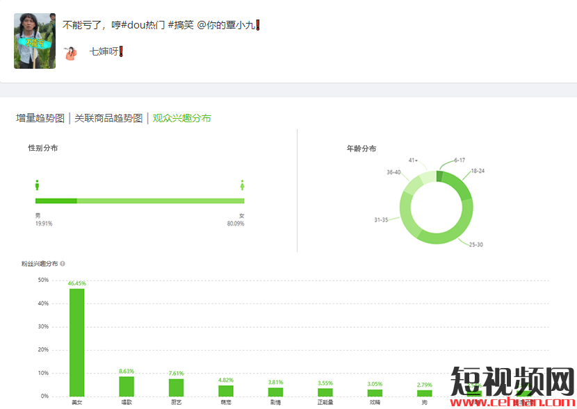 查看【監(jiān)控歷史】,我們發(fā)現(xiàn)「七嬸呀??」的視頻粉絲主要以25-30的女性用戶為主,而粉絲興趣分布主要擊中在才藝和生活類領(lǐng)域 。再結(jié)合自己的粉絲畫像,如果我們現(xiàn)有的粉絲畫像和「七嬸呀??」的視頻比較貼合,那么我們?cè)谂臄z視頻時(shí)也可以借鑒他的內(nèi)容方向,相信也會(huì)有不錯(cuò)的流量曝光。