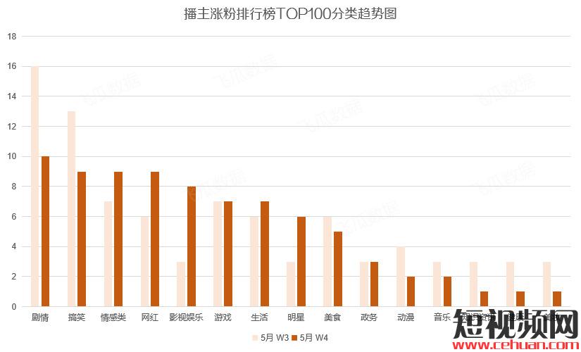 2020年將近過(guò)半了,最近抖音上有什么類型的賬號(hào)漲粉比較快?又有什么賬號(hào)最近憑借一個(gè)視頻漲粉百萬(wàn)呢?通過(guò)飛瓜數(shù)據(jù)上兩周播主排行榜周榜TOP100的數(shù)據(jù),我們發(fā)現(xiàn)近期在抖音上,劇情類 的賬號(hào)漲粉效率較高,其次是網(wǎng)紅、搞笑類 的賬號(hào)。