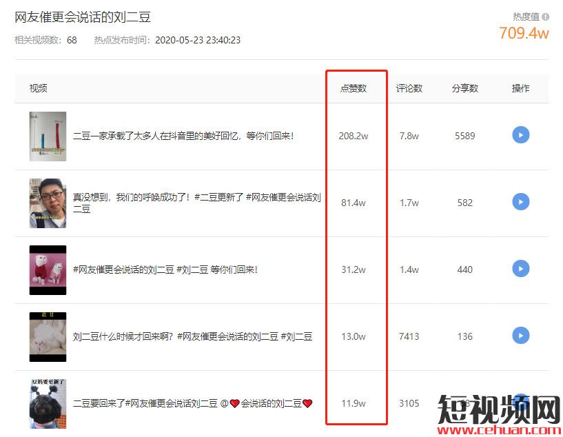 點(diǎn)擊播放視頻,我們看到播主先在視頻開(kāi)頭發(fā)了一個(gè)抖音熱點(diǎn)榜截圖 ,接著是“二豆”尋找不同聲音的來(lái)源,迎合“網(wǎng)友催更會(huì)說(shuō)話的劉二豆”這個(gè)話題的主題。由于熱門話題的自帶流量,以及該帳號(hào)本身的影響力,該視頻在短短幾分鐘點(diǎn)贊數(shù)就破萬(wàn) ,并產(chǎn)生一個(gè)新的話題#會(huì)說(shuō)話的劉二豆回應(yīng)網(wǎng)友催更。那么我們?cè)撛趺床榭丛撛掝}的熱度值呢?