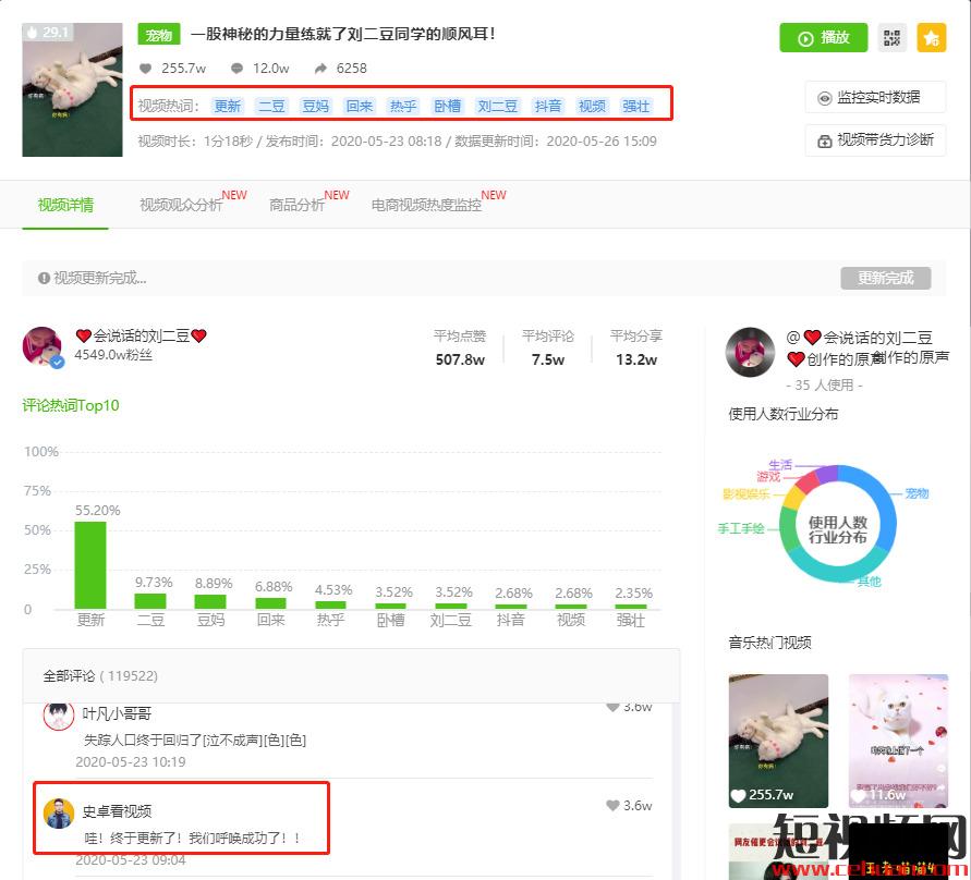 △飛瓜數(shù)據(jù)-播主詳情頁(yè)通過(guò)【播主視頻】,我們發(fā)現(xiàn)「??會(huì)說(shuō)話的劉二豆?? 」在5.23發(fā)布的【一股神秘的力量練就了劉二豆同學(xué)的順風(fēng)耳】,獲贊255w,評(píng)論高達(dá)12w ,可見(jiàn)她的突然漲粉很可能是由這條視頻引起的。