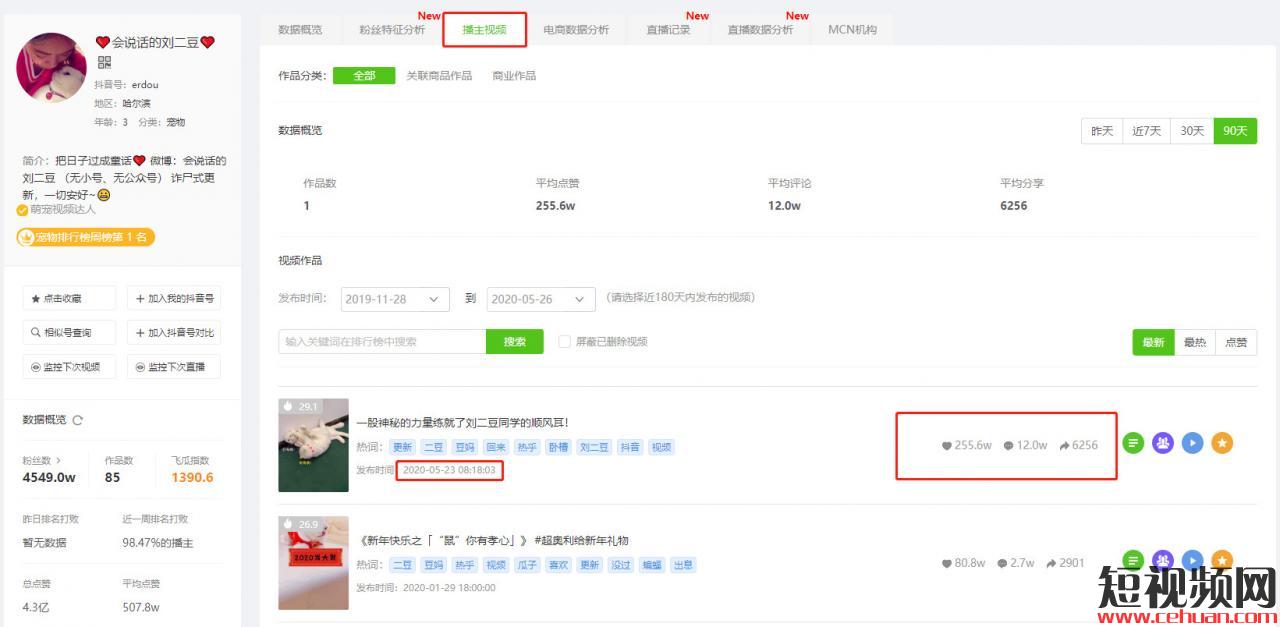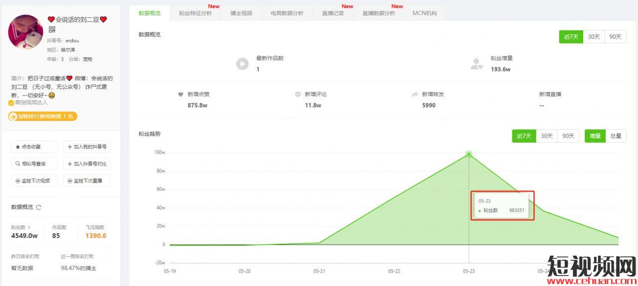 斷更4個(gè)月人氣不減反增如果你平時(shí)在抖音上喜歡看萌寵類視頻,那么對(duì)“劉二豆”和“瓜子”這兩個(gè)名字一定不會(huì)陌生。它們的主人「??會(huì)說(shuō)話的劉二豆?? 」在上周漲粉186w,并在5.23當(dāng)天漲粉近100w 。那么她究竟發(fā)布了什么視頻呢?