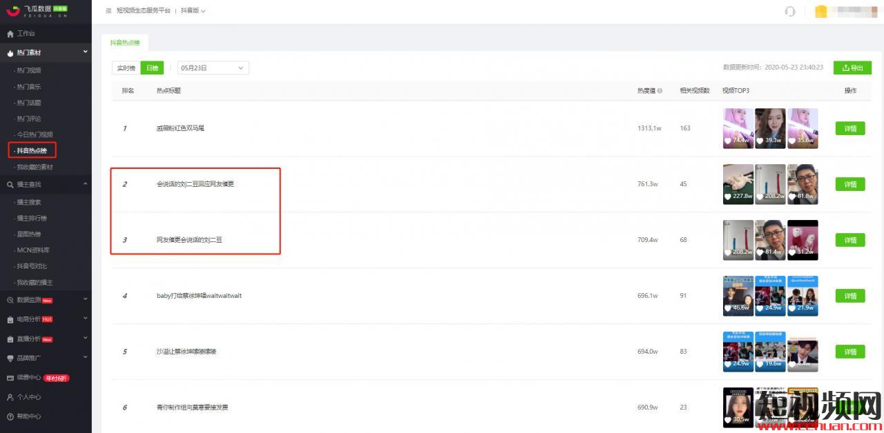在飛瓜數(shù)據(jù)新上線【抖音熱點(diǎn)榜】,可以實(shí)時(shí) 查看抖音的熱點(diǎn),還可以根據(jù)日期 查看每日的榜單。不僅可以查看話題的熱度值和關(guān)聯(lián)視頻數(shù),還可以查看該話題下的視頻數(shù)據(jù)。我們發(fā)現(xiàn)5.22和5.23,“催更劉二豆”的話題都在熱點(diǎn)榜top3中,熱度值均達(dá)700w+,相關(guān)視頻超100個(gè)。