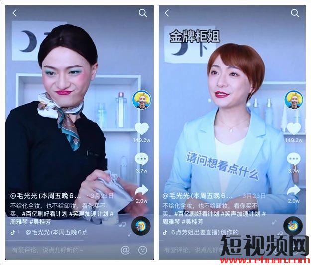 直到3月23日,毛光光發(fā)布第二條“柜姐”系列視頻《不給化全妝,也不給卸妝,看你買不買》,其中“金牌柜姐和普通柜姐”的強(qiáng)烈反差,很快吸引了許多用戶觀看,視頻累計(jì)點(diǎn)贊數(shù)達(dá)到149萬。
