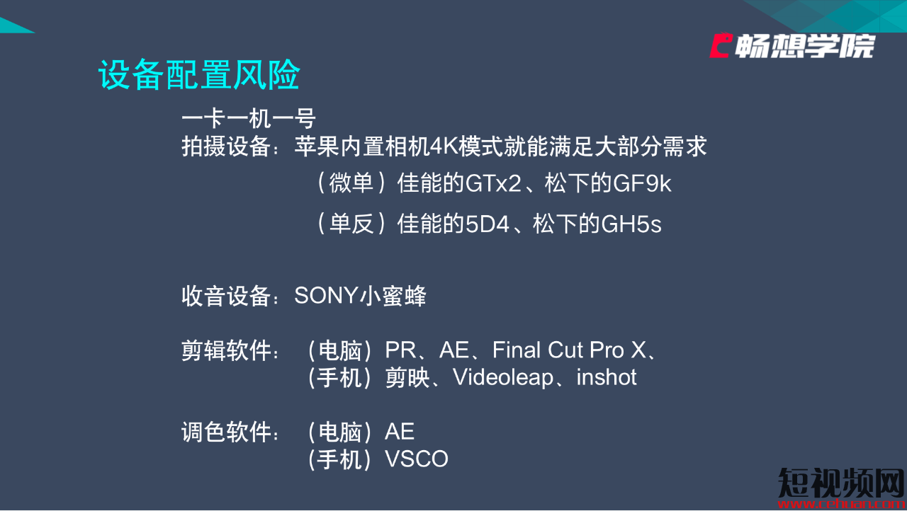 風(fēng)險六:設(shè)備配置很多行業(yè)內(nèi)的朋友,為了做短視頻,買一套電影級設(shè)備,但是拍短視頻不需要這么高級的設(shè)備,其實很多時候就是用手機拍也能解決。比如說抖音,官方的剪輯軟件-剪映,內(nèi)容剪完之后一鍵分享到自己的平臺。這里推薦了一些拍攝、剪輯、調(diào)色設(shè)備。 風(fēng)險七:創(chuàng)意模仿