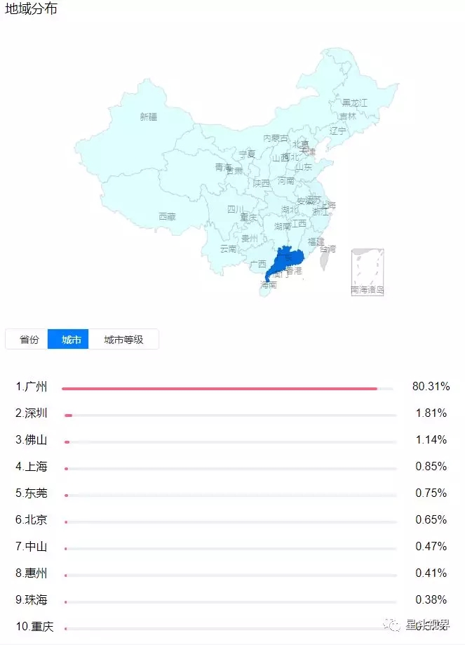 我們再看看地域分布,從下圖中,可以看到,這個(gè)賬號的用戶非常垂直,來自其號主所在城市“廣州”的用戶占比高達(dá)80.31%。