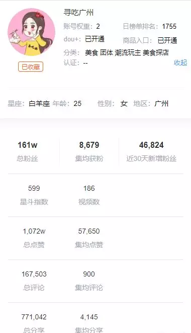 從數(shù)據(jù)中可以看出,該在賬號總共發(fā)布185條視頻,平均單條視頻獲粉8731,獲贊57862,評論890,分享4159,用戶互動(dòng)的表現(xiàn)也非常出色。