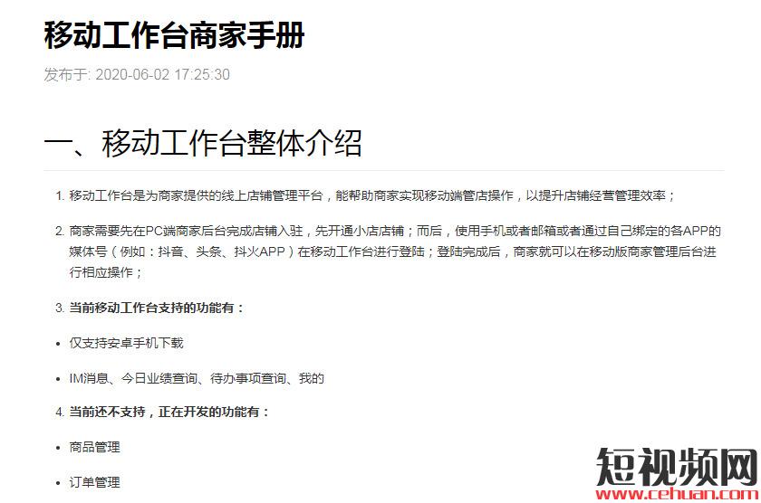 不僅抖音小店個人入駐開放,抖音還推出了抖音小店獨立APP——“抖店” ,開通抖音小店的商家,可以在移動端操作商家后臺系統(tǒng)。 “抖店”APP支持今日頭條、巨量引擎、抖音、火山賬號四種登陸方式。商家移動工作臺僅支持安卓手機下載,商家在移動端可以操作的功能包括: