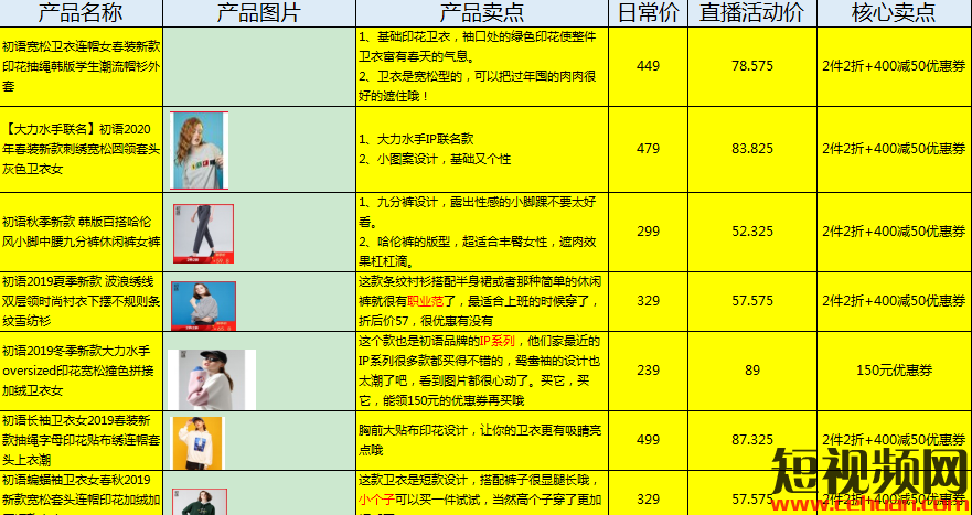 每一款產(chǎn)品定制一份簡單的單品直播腳本,以表格的形式,將產(chǎn)品的賣點和優(yōu)惠活動標注清楚,可以避免主播在介紹產(chǎn)品時手忙腳亂,混淆不清。